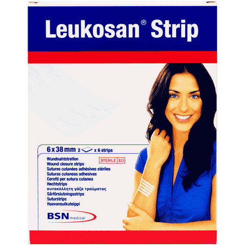 CEROTTO LEUKOSAN STRIP CEROTTI PER SUTURE Formato Confezione da 2 buste da 6 strips ciascuna da 6mm x 38 mm Cerotti per sutura cutanea indicati per la chiusura atraumatica di ferite. Utili dopo rimozione di punti metallici o suture per facilitare la cicatrizzazione. Studiato per garantire un'adesivita' e una traspirabilita' ottimali. Ridotto rischio di infezioni e reazioni cutanee. Rimozione indolore. Indicato anche per la pelle sensibile e fragile dell'anziano. [EAN: 4042809703917]